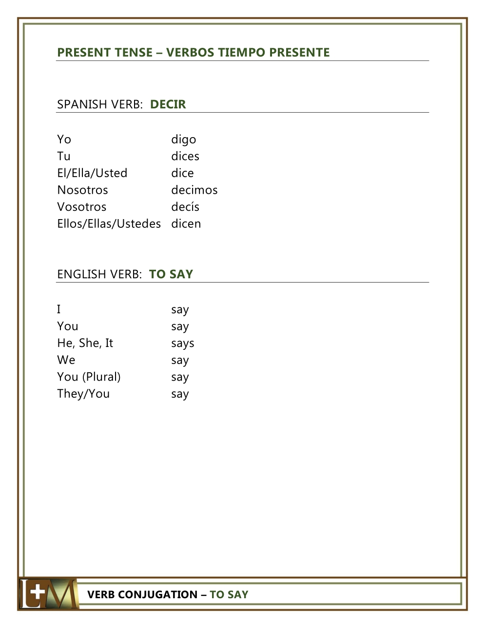 This list will flesh out a little more than what is presently found below. There are certain, important verbs that I do not feel should be tackled immediately, as they might well confuse the student. For example: the Spanish verb “haber” (essentially meaning “to have”) is an auxiliary verb that carries with it a few different rules of usage than does the more standard “possession” verb “tener”. More will come as I find them.