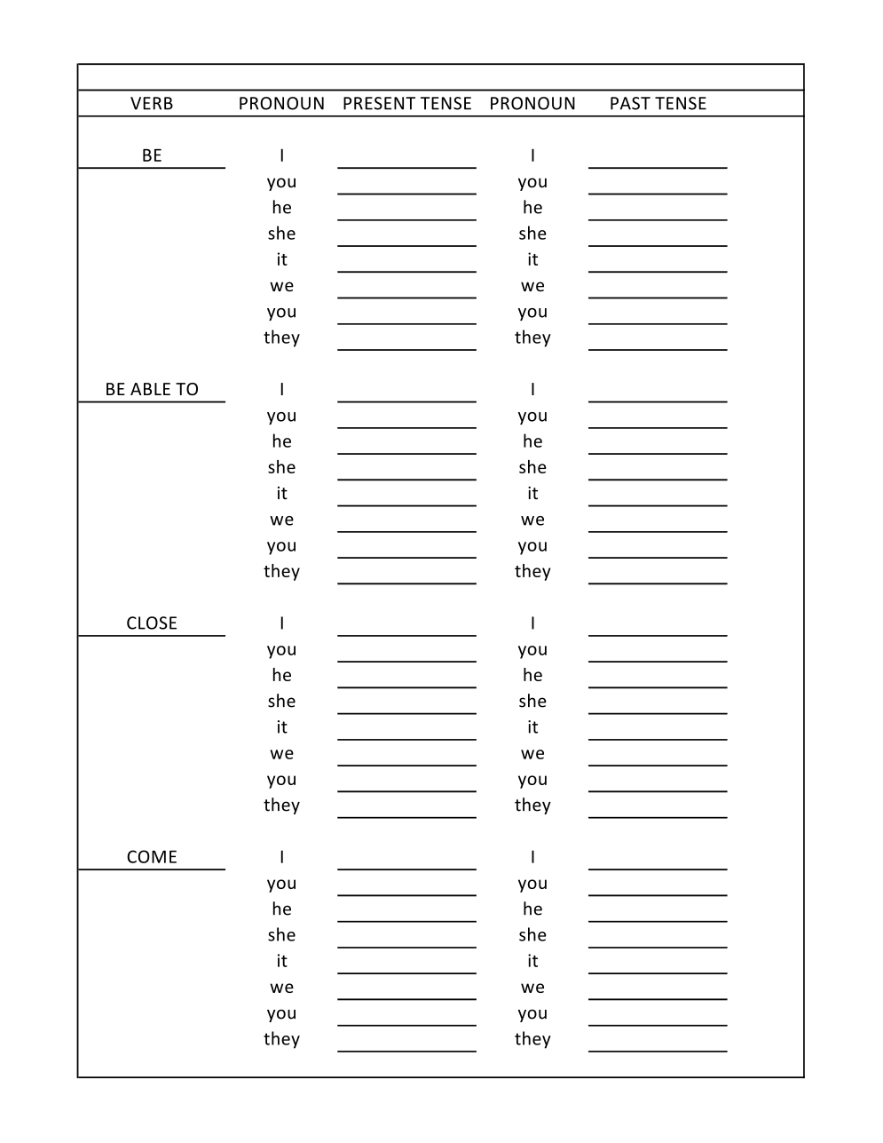 The worksheets as simple exercises listing the Starter Verbs and asking the student to fill in the blanks on conjugation in both the Present and Preterite Past tenses.